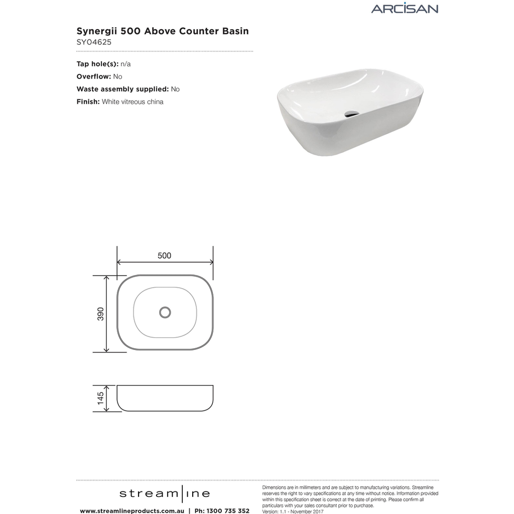 Streamline Arcisan Synergii Above Counter Basin - 500mm X 390mm