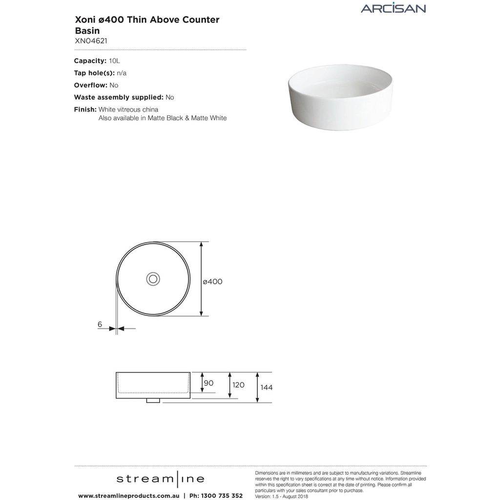 Streamline Arcisan Xoni Thin Round Above Counter Basin 400mm - Dia White