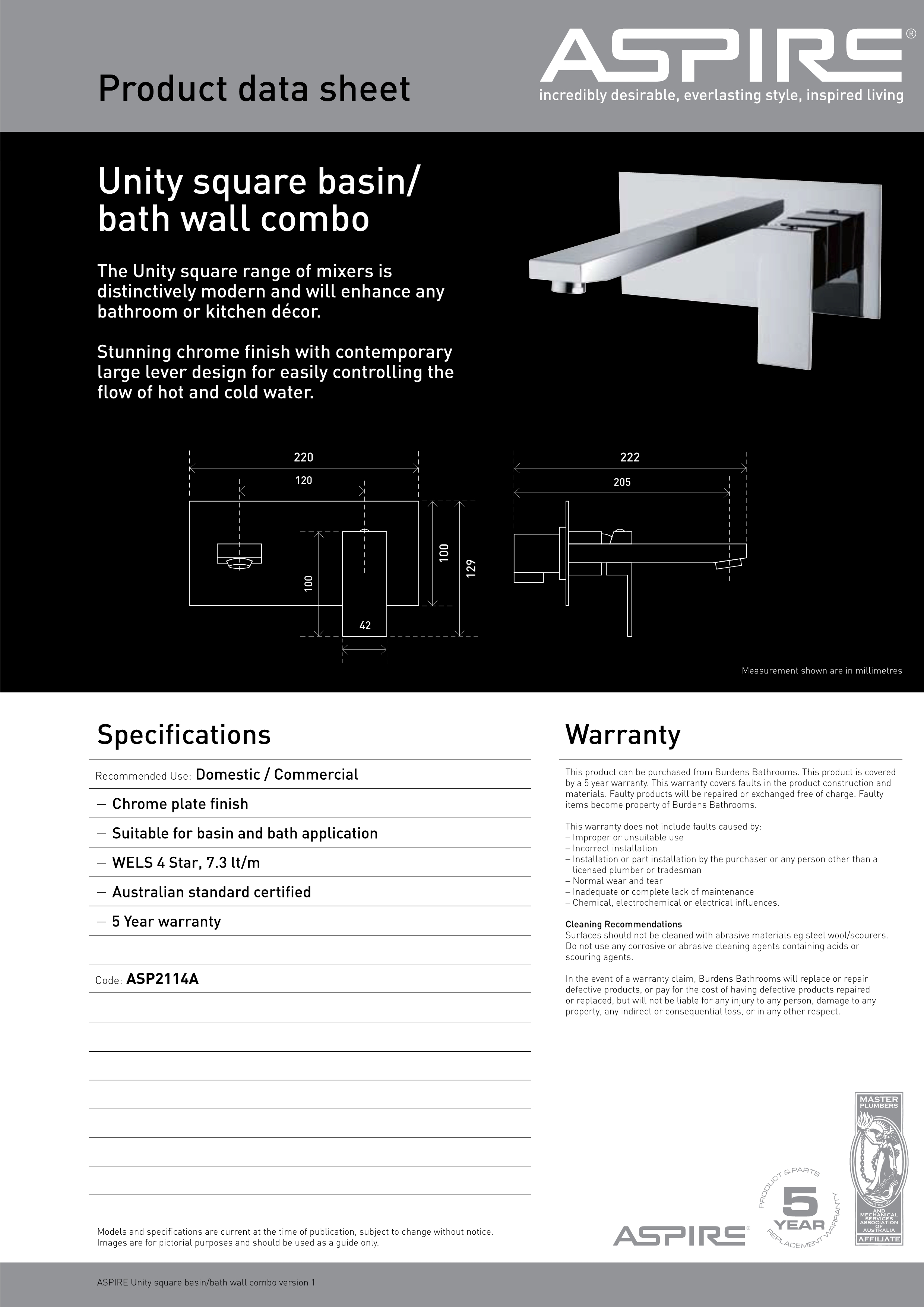 Aspire Unity *Sq* Basin/Bath Wall Mixer Combo 170mm Spout
