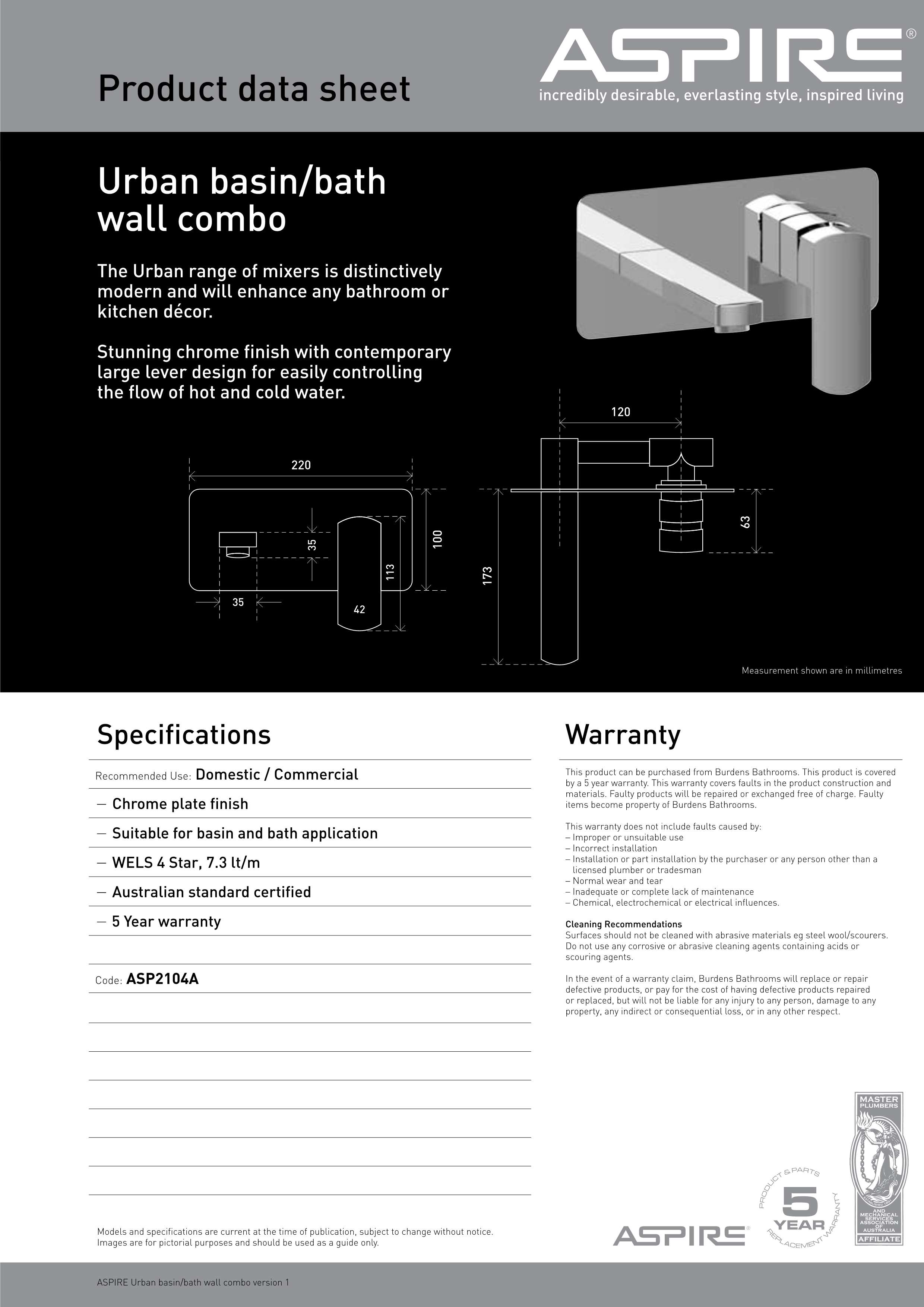Aspire Urban Basin/Bath Wall Mixer Combo Chrome 170mm Spout