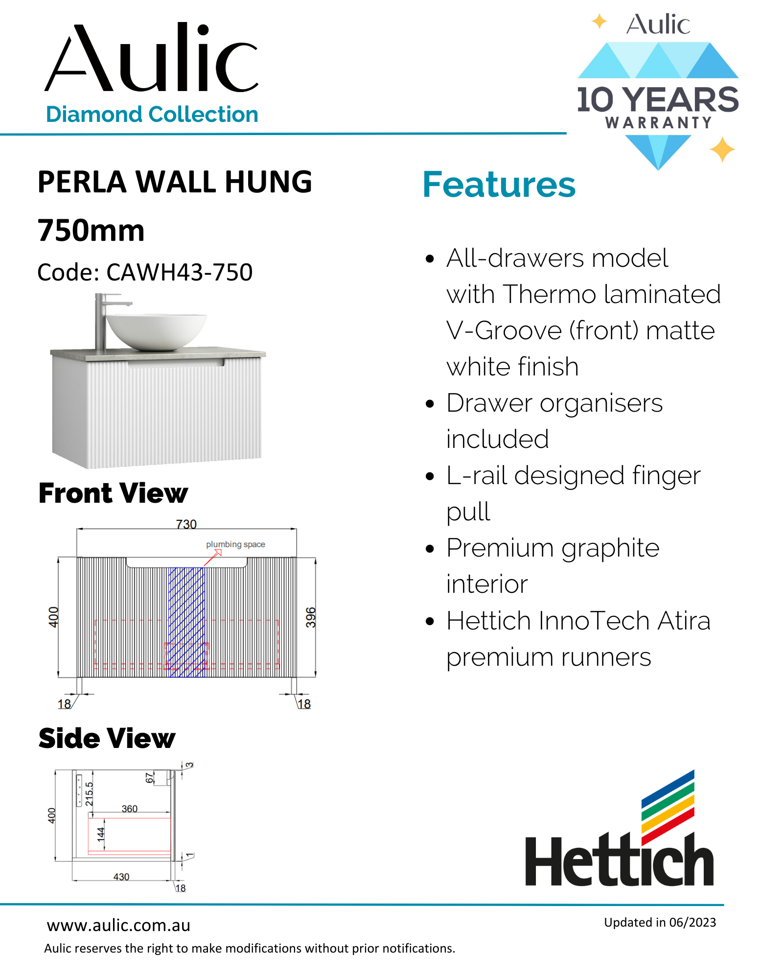 Aulic Perla Mark Ii Wall Hung 750 Cabinet With Crystal Ceramic Top