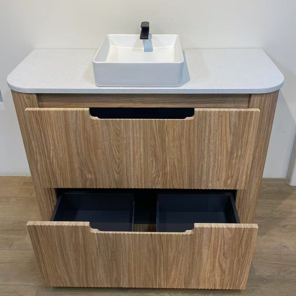 Aulic Varcelli Floor Standing Harvest Oak Fluted Curved Cabinet 750X460X880mm With Pure Flat Stone Top