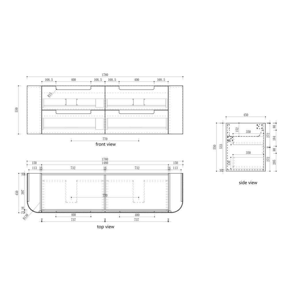 Aulic Varcelli Tier Wall Hung H/Oak Fluted Curved Cabinet 1800X460X425mm & Palis White Flat Stone Top