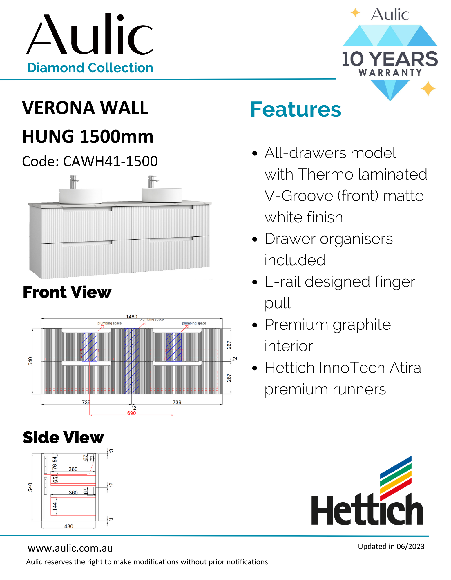 Aulic Verona Mark Ii Wall Hung 1500 Cabinet Double Bowl With Crystal Ceramic Top