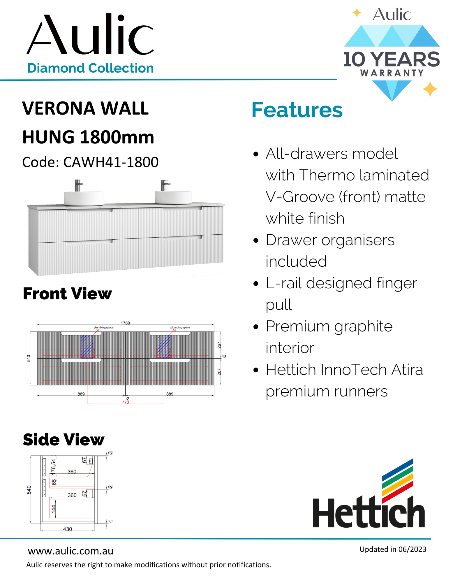 Aulic Verona Mark Ii Wall Hung 1800 Cabinet Dbl Bowl With Alpine White Stone Top & U/M
