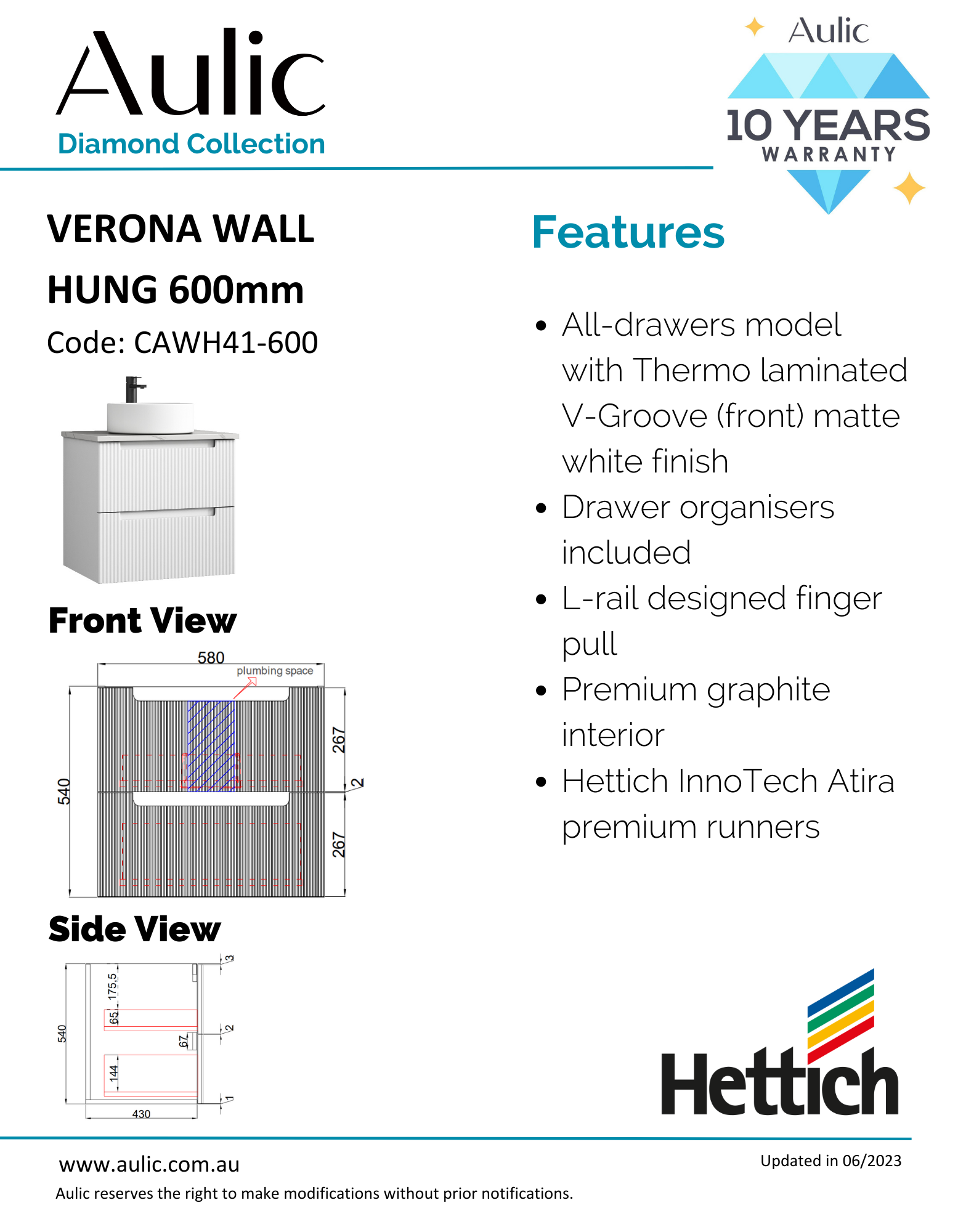 Aulic Verona Mark Ii Wall Hung 600 Cabinet With Snow Flat Stone Top