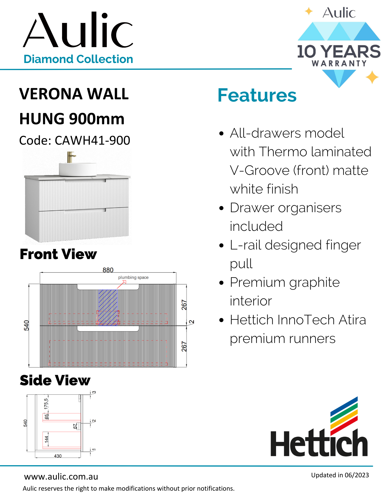 Aulic Verona Mark Ii Wall Hung 900 Cabinet With Pure White Stone Top With U/M Basin