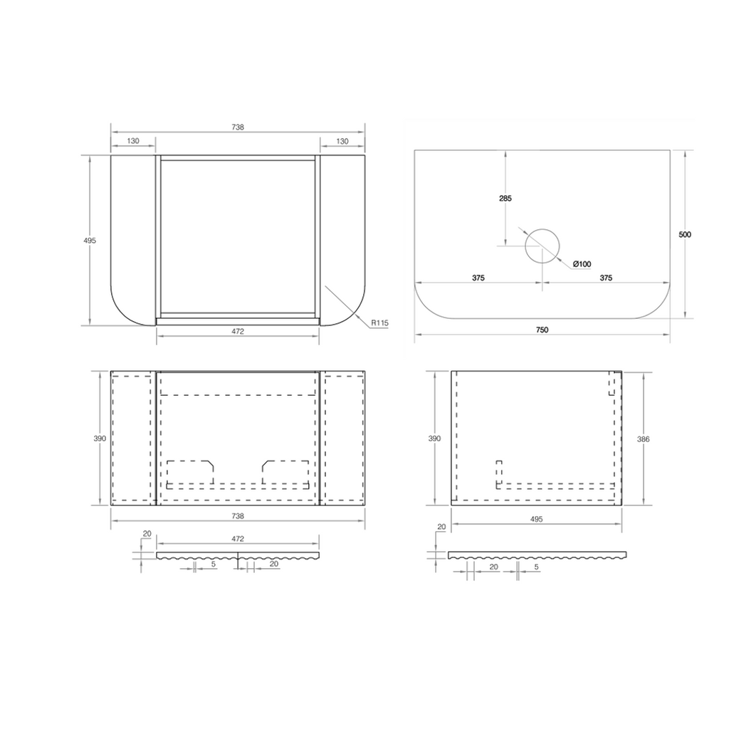 Cassa Design V-Groove 750mm Curvel Wall Hung Vanity Stone Top, Natural Oak