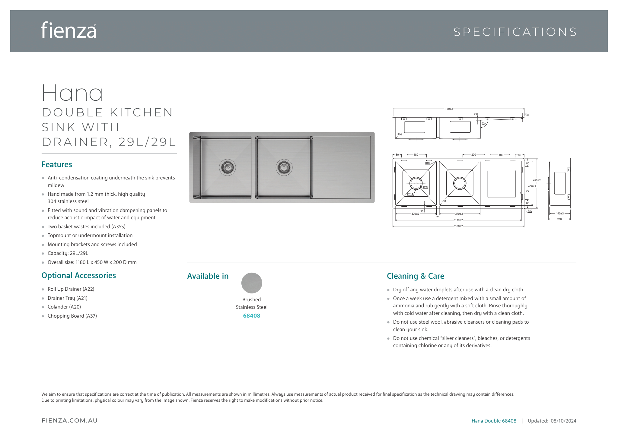 Fienza Hana Double Kitchen Sink - 29L/29L