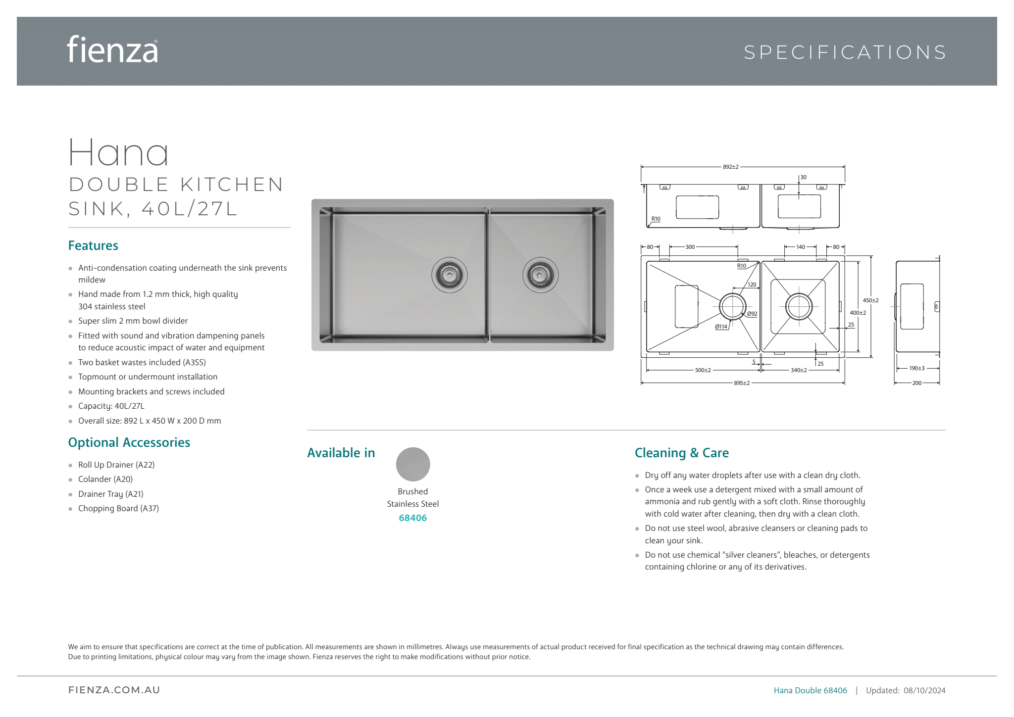 Fienza Hana Double Kitchen Sink - 40L/27L