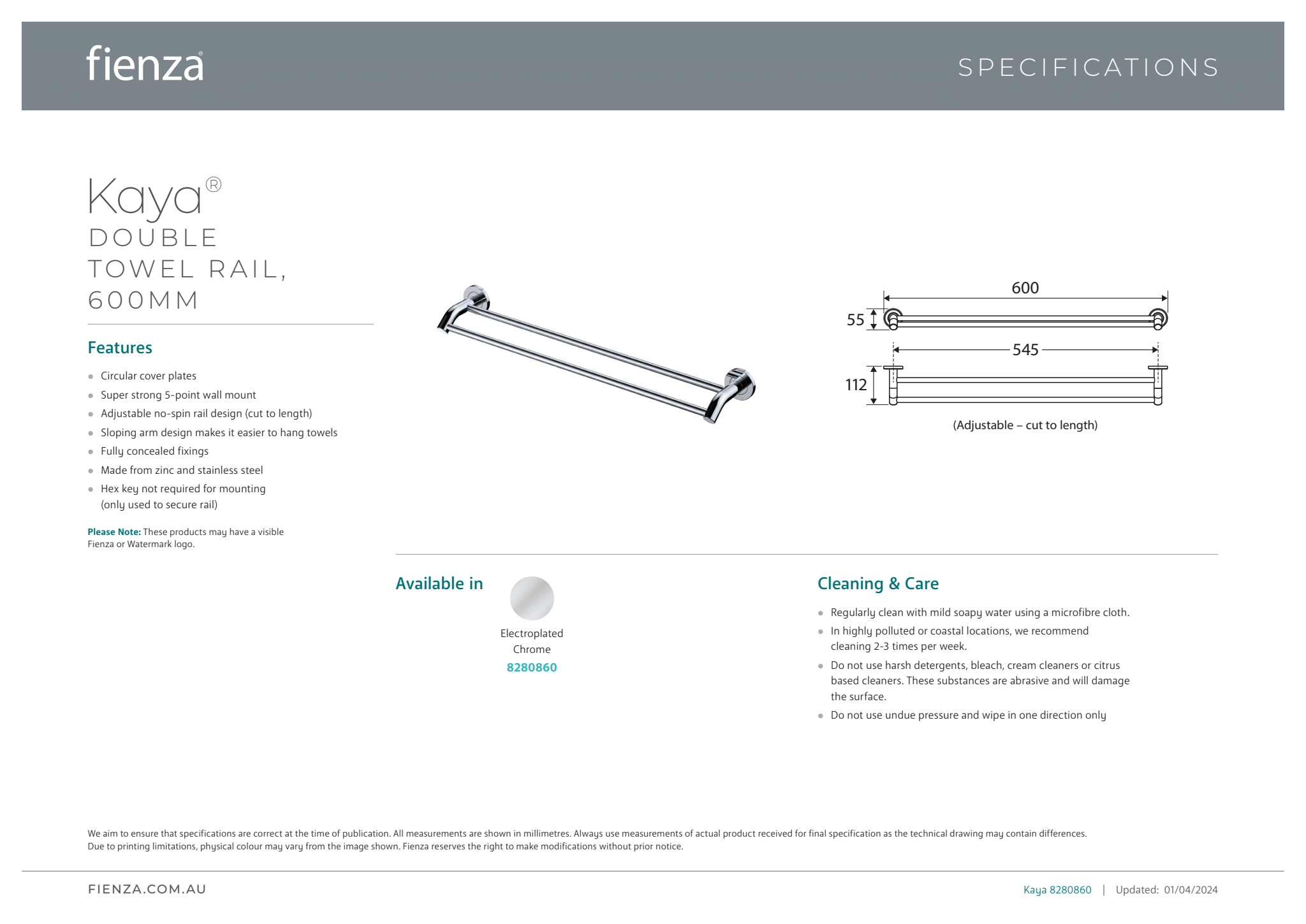 Fienza Kaya Double Towel Rail 600mm - Chrome