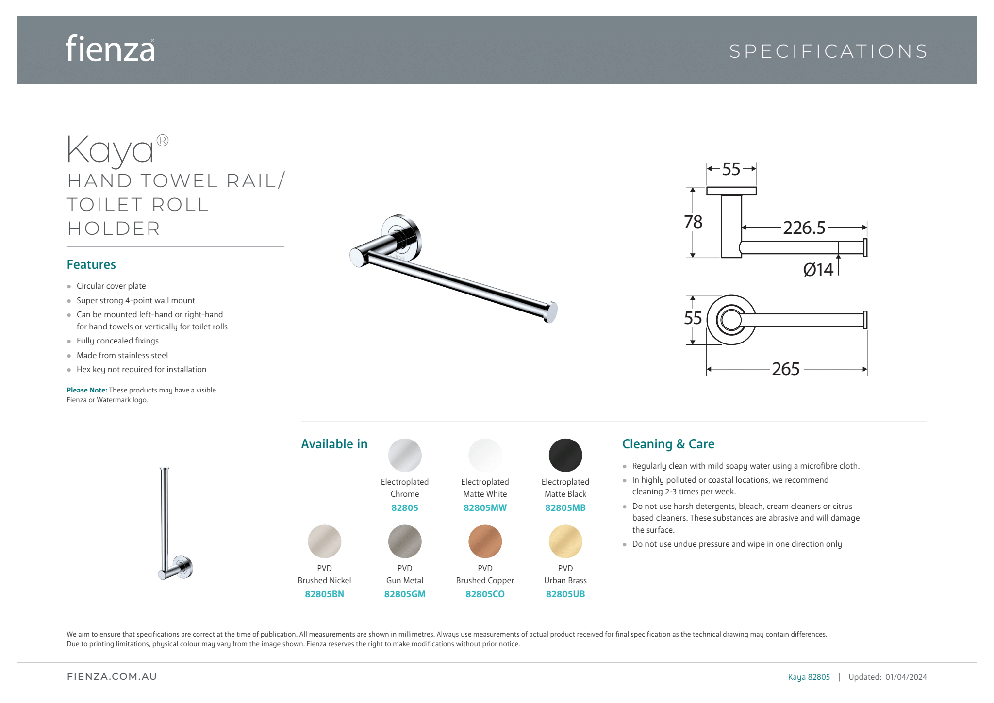 Fienza Kaya Hand Towel Rail / Toilet Roll Holder - Gun Metal