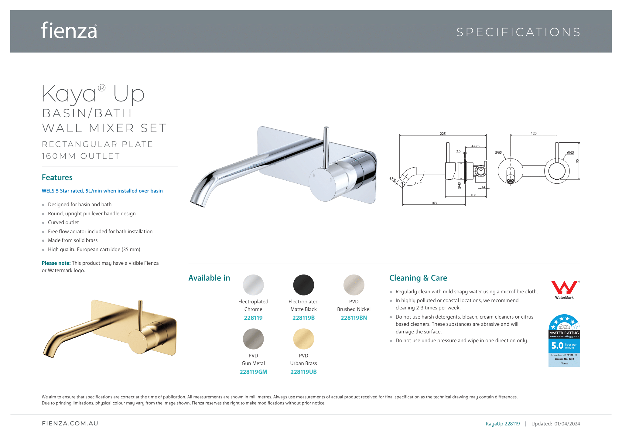 Fienza Kaya Up Basin/Bath Wall Mixer Set 160mm Outlet Set Rectangular Plate - Gunmetal