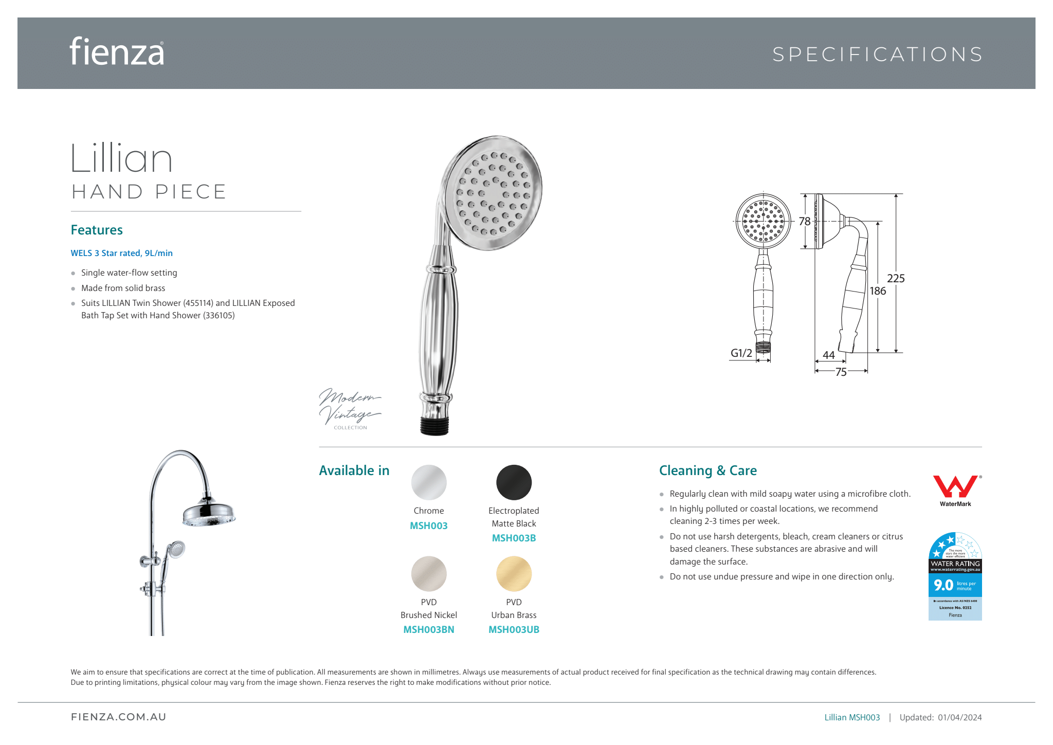 Fienza Lillian Twin Rail Shower Hand Piece - Chrome