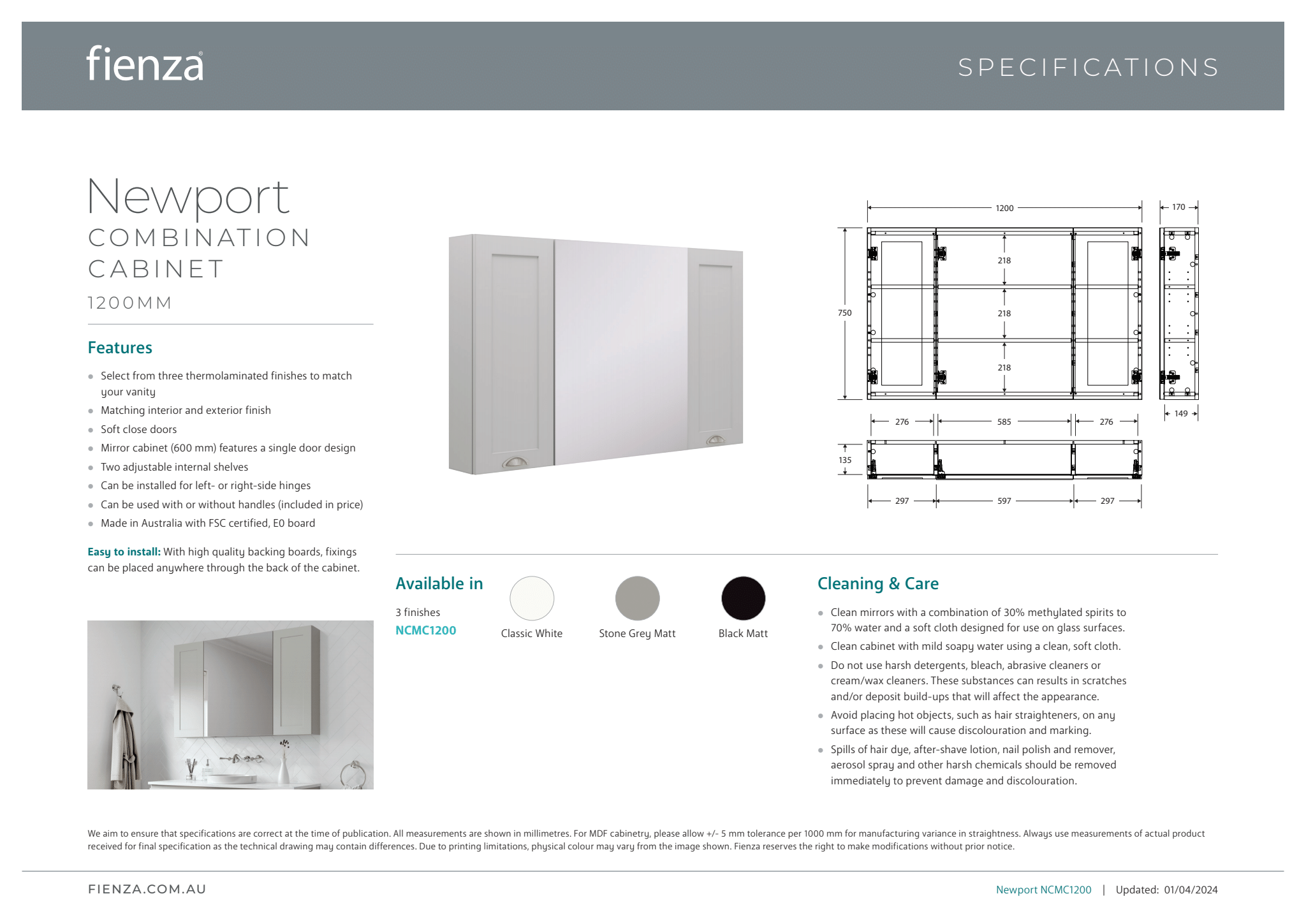 Fienza Newport Combination Mirror Cabinet - 1200mm 3D