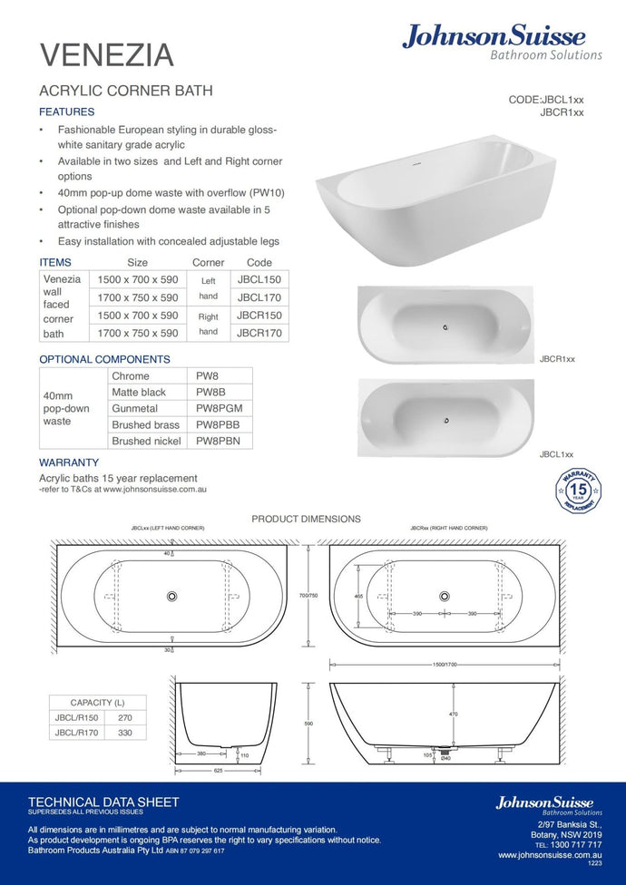 Johnson Suisse Venezia Corner Left Acrylic Bath 1700 X 750 X 590 Of P&W Matte White