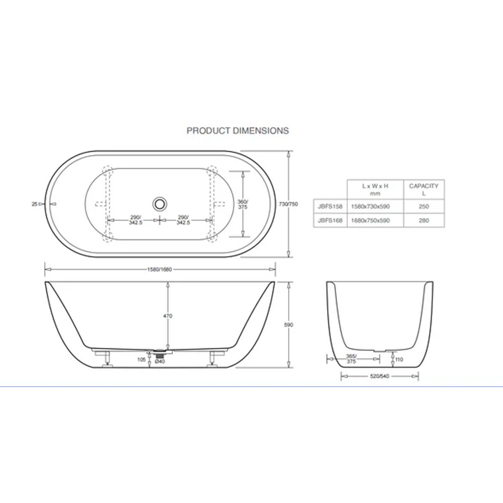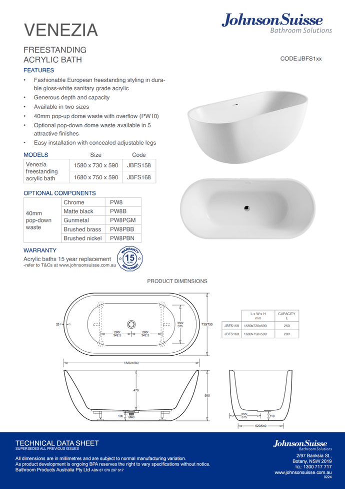 Johnson Suisse Venezia Freestanding Acrylic Bath 1680 X 750 X 590 Of P&W Matte White