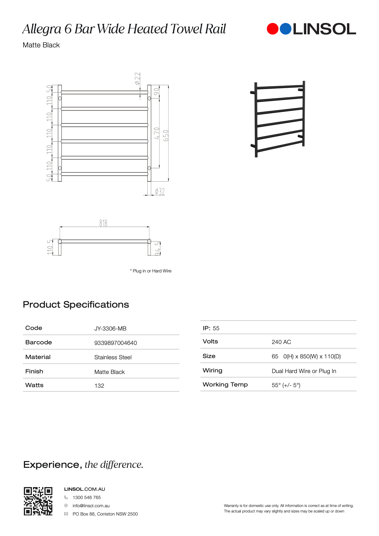 Linsol Allegra 6 Bar Wideheated Towel Rail - Matte Black