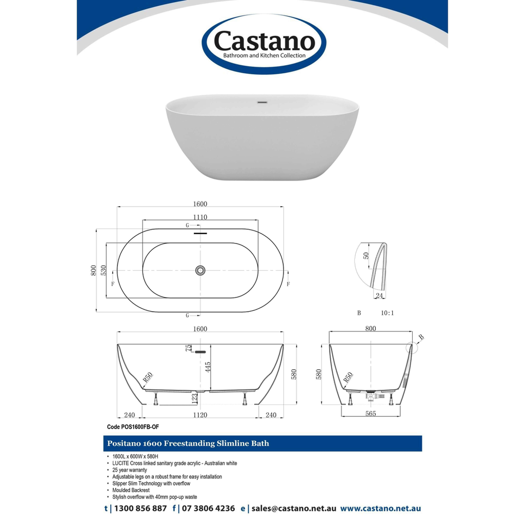 Positano Slimline Freestanding Lucite Bath 1600mm